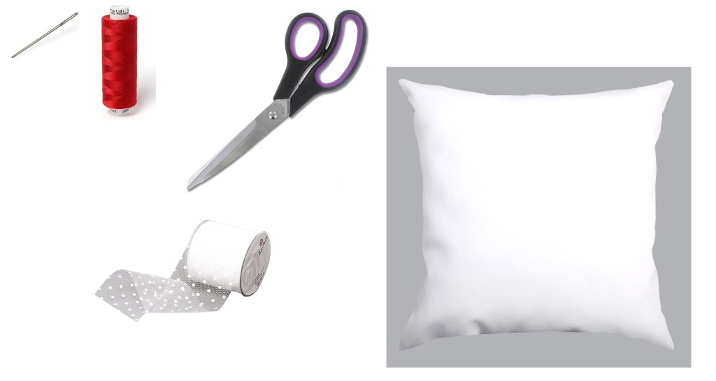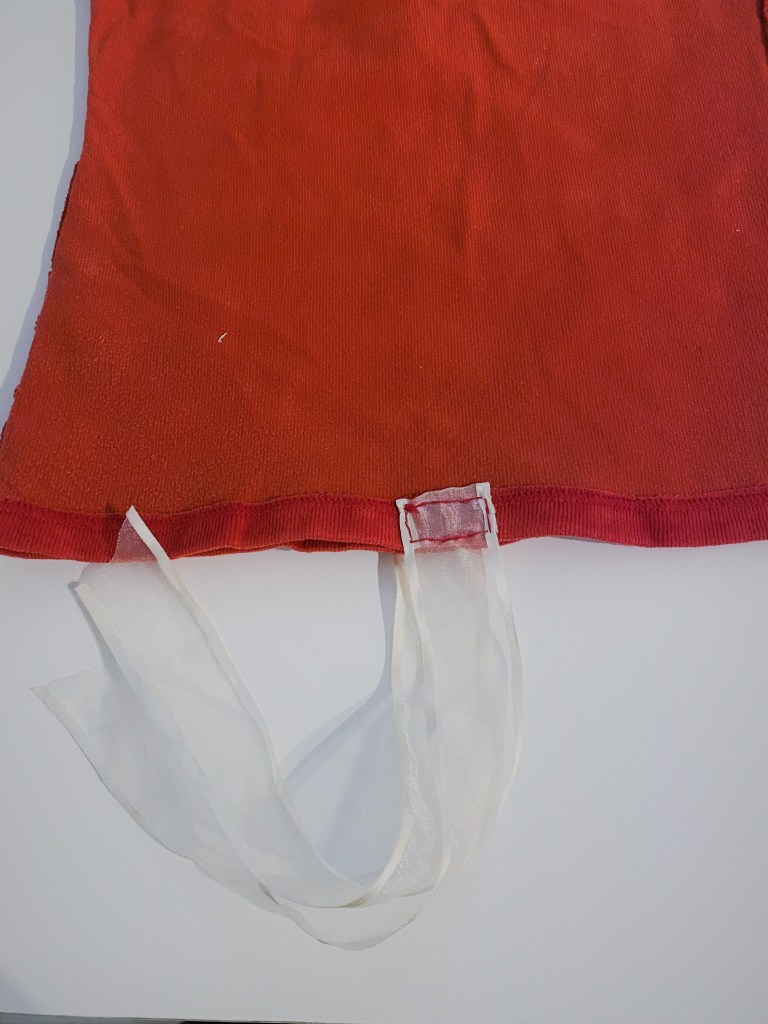 4. prendete il nastro e tagliatelo a metà cucendone una parte al centro di uno dei due lembi di stoffa presenti sul lato aperto e l’altro, sul lato opposto, esattamente nello stesso punto.