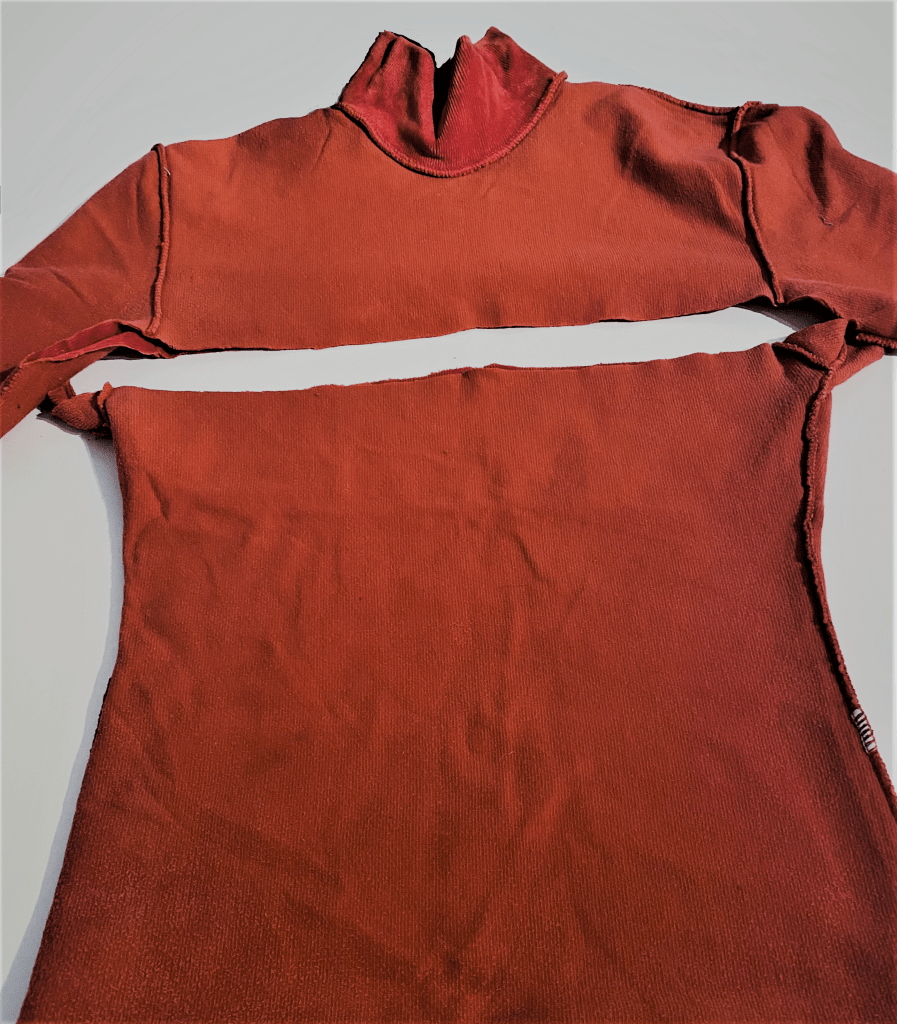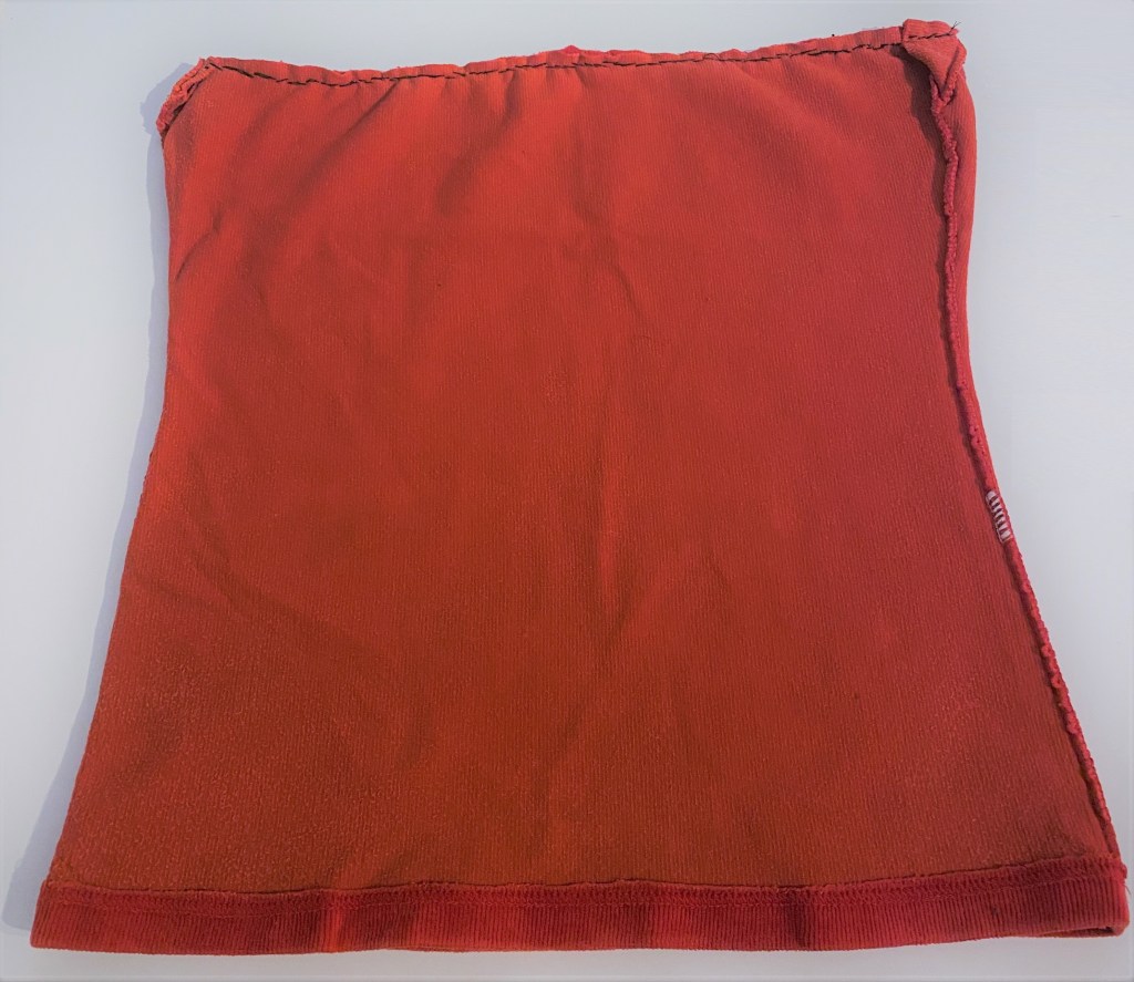 - prendere una maglia che all’altezza dell’addome sia in grado di contenere per dimensioni la grandezza del cuscino e capovolgetela in modo che siano visibili le cuciture. Fate una prova poggiando il cuscino sulla maglia, se lo contiene tutto, va bene. Se il tessuto non è minimamente elastico, provate ad inserire il cuscino nella maglia;