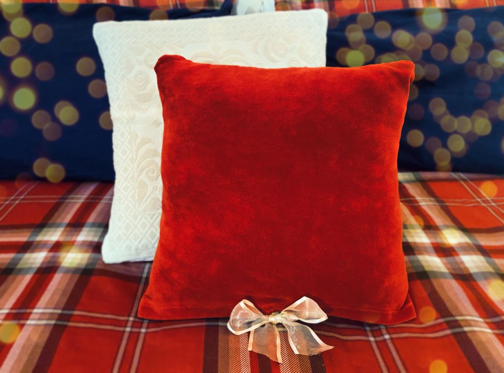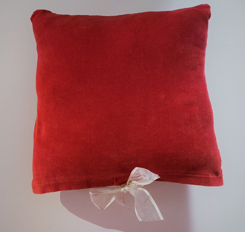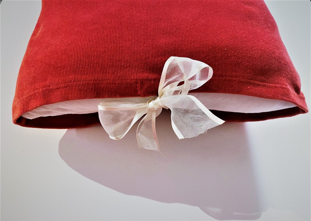 Capovolgete quella che ormai è una federa e non più una maglia, inserite il cuscino, chiudete il lato aperto annodando i due pezzi di nastro cuciti et voilà: la vostra federa è pronta nell’arco di pochi minuti.
