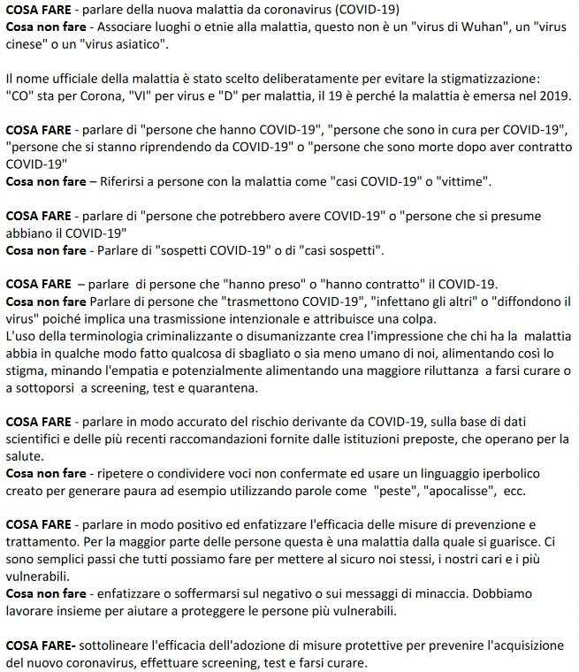 Non addentrarsi in spiegazioni o supposizioni su argomenti che non si conoscono, soprattutto quando ci si rivolge a categorie fragili come bambini, anziani o persone che non parlano bene l’italiano. Usare parole semplici, adatte al nostro interlocutore, dare notizie certe senza lasciarsi andare a drammatizzazioni ulteriori e inutili della notizia è l’unico modo per agevolare la corretta informazione. E ricordiamo: in nessun caso utilizzare termini che alimentano paura, colpevolizzano o “disumanizzano” chi è colpito dalla malattia