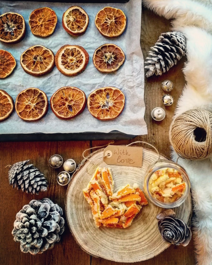 Tagliate sottilmente le arance – massimo 5mm l’una – e appoggiatele una accanto all’altra, nel forno. Lasciate cuocere per 2 ore in forno statico, a 100° o 1 ora a 120°, mantenendo la porta leggermente aperta e con l’aiuto di un cucchiaio di legno, giratele ogni mezz’ora. Aspettate che si raffreddino anche per diverse ore e usatele come meglio preferite: appese all’albero con un ben nastrino o uno spago, in un centro tavola, sulla corona per la porta ecc.